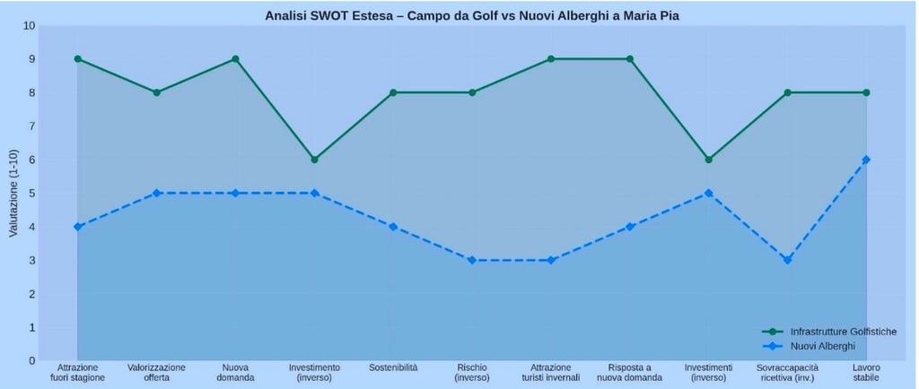 Dal grafico comparativo delle ipotesi per il futuro di Maria Pia, che contrappone il parco multifunzionale con percorso da golf vs. parco multifunzionale con nuova ricettività alberghiera, emerge chiara e ben marcata la potenzialità superiore dell’ipotesi Congressional Park Stadium.