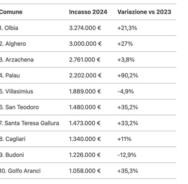 In Sardegna, 40 comuni applicano la tassa di soggiorno, con un gettito totale di 29,5 milioni di euro nel 2024 (+16,9% vs 2023). Ecco la Top 10: