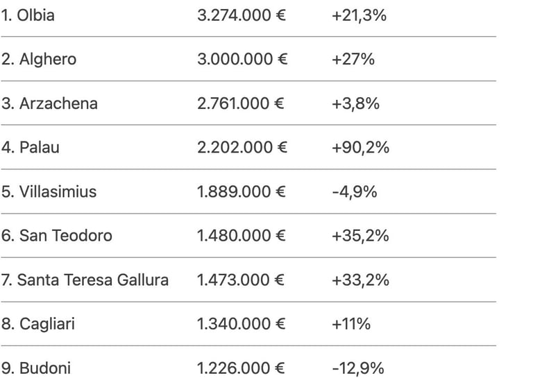Palau registra il balzo più significativo (+90,2%), scalando quattro posizioni grazie al turismo diretto all’arcipelago della Maddalena. Villasimius e Budoni, invece, segnano un calo, sintomo di possibili criticità gestionali.