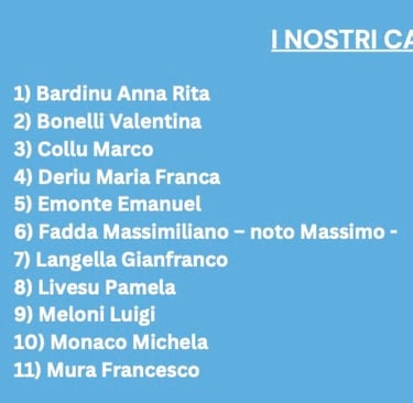 La lista è orgogliosa di presentare i suoi candidati, ognuno dei quali è profondamente legato alla città e motivato dal desiderio di contribuire attivamente al suo sviluppo. I candidati di "Prima Alghero" sono pronti a mettersi al servizio dei cittadini, portando avanti progetti e iniziative che mirano a migliorare la qualità della vita in città, rispettando e valorizzando il patrimonio culturale e naturale di Alghero.